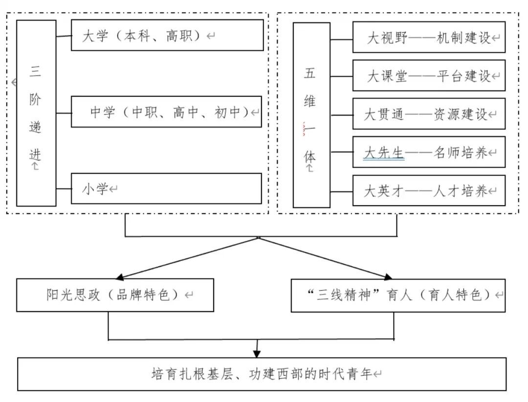 (二)纵向上,“三阶递进、五维一体”推动三线精神融入攀枝花市大中小学思政课一体化建设,通过“阳光思政”培育扎根基层、功建西部的时代青年。马克思主义学院以四川省大中小学思政课一体化建设为契机,紧密围绕立德树人根本使命,以“三线精神”为主要内容,以“阳光思政”为核心品牌,与攀枝花市教体局、高职、中职、高中、初中、小学等单位构建“三阶递进、五维一体”的大中小学思政课一体化育人格局。
