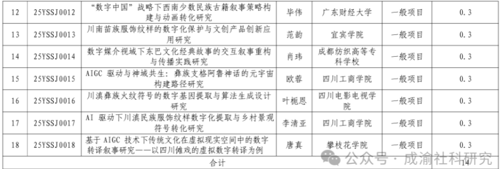 根据学校相关工作安排,科研处与川滇民族文化数字化与传播重点实验室2025年度艺术设计专题项目立项开放课题申报工作。经组织申报、专家评审、立项公示、校长办公会审定,现对“川滇多民族纹样语义图谱与可控生成的本体构建、测评基准与文创转化研究”等开放课题18项予以立项,其中重点项目3项,20000元/项;培育项目5项,10000元/项;一般项目10项,3000元/项;重点项目研究期限为1-2年,一般项目研究期限为1年,项目开始时间自2025年10月30日起算。项目经费一次性全额拨付到项目承担单位(立项名单见附件)。