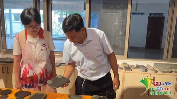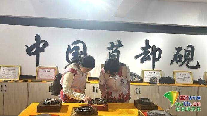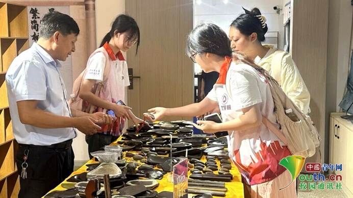 图为非遗传承人向实践队员重点讲解苴却砚珍品独特的“石眼”的形成机理和文化象征。队员王银提到,“‘石眼’不仅是砚台品质的核心指标,又承载着人与自然和谐共生的生态智慧”。(张蕊 供图)