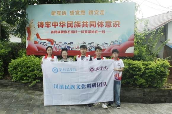 图为实践团在铸牢中华民族共同体意识标语前的合照 张萌飞 供图