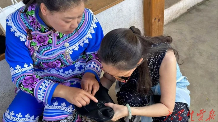 ▲图为实践队员在非遗小院体验彝绣技法,纳永芳(左)演示如何用“平针绣”表现索玛花纹样。