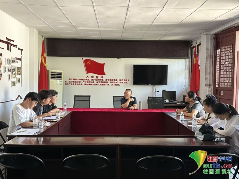图为实践团在村委会议室,与村干部交流田坝村的经济与文化状况。张萌飞供图