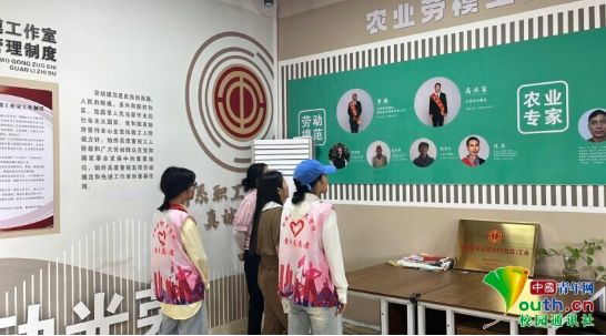 图为村干部带领实践团成员参观并讲解劳动模范展板。张蕊 供图