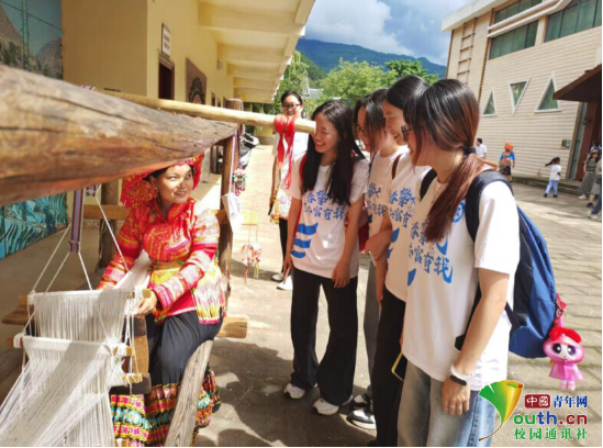 图为实践团成员观摩非遗织布技艺、与传承人交流。唐平供图