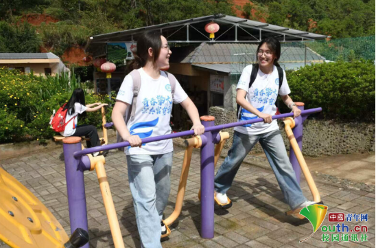 图为实践团成员在新山村的健身器材上运动,感受乡村公共服务成果。许丹供图
