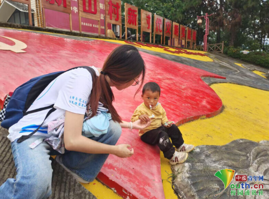 图为实践团成员给村里孩子分享糖果。赵灵语 供图