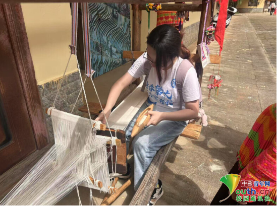 图为实践团成员唐平体验非遗织布技艺。赵灵语供图