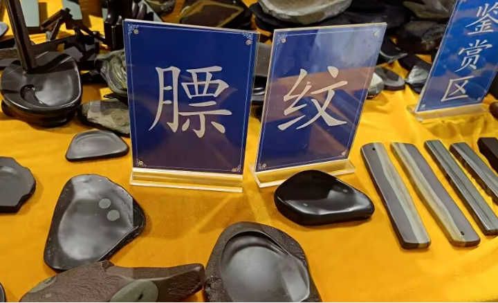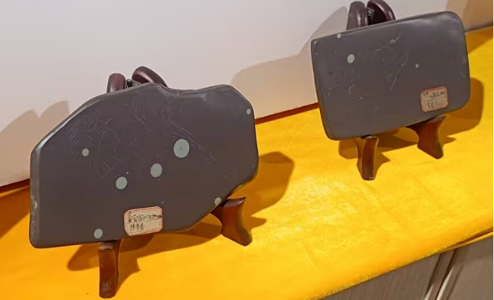 据毛金祥老师介绍,苴却砚由苴却石材制作而成,按照石平特征可分为膘石砚、眼石砚、线石砚及纯色砚,苴却砚雕刻融合阳雕、透雕、浮雕等技法,“因材施艺”是其核心原则。工匠善用天然纹理进行巧雕,细腻光滑,这种砚台质地细腻,纹理如云,根据苴却石材的纹理、雕刻工艺等可以判断最终雕刻而成的苴却砚的价值。苴却石可根据其石品花纹的总体特征,将其分为苴却眼石、苴却膘石、苴却眼膘石、苴却青铜石、苴却绿石、苴却青绿石、苴却紫砂红石及苴却彩石。其石类之多、石色丰富、石质优异、石品绚丽,苴却石制品已是攀枝花一张独居地域特色的文化名片。