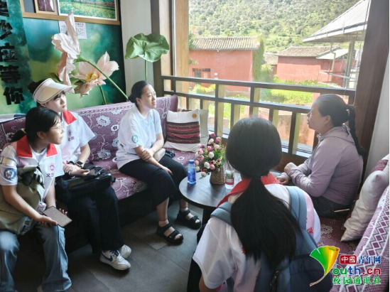 图为实践团成员与第四代彝绣非遗传承人纳永芳交流,深刻了解到她学习彝绣的经历以及针法技艺的精妙。