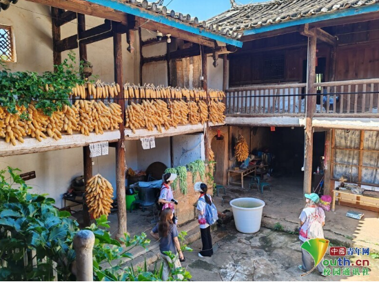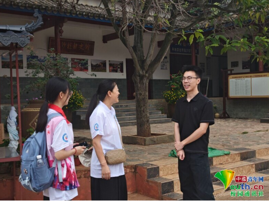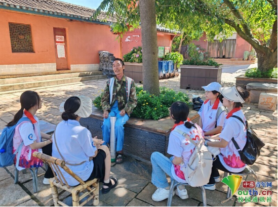 图为实践团成员在游客中心志愿者张静的带领下参观百年老宅,领略当地特色古朴建筑的魅力。