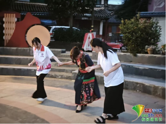 图为实践团成员与村民在文化广场一起打跳,体验民族风情。