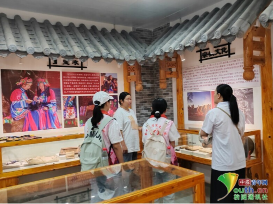 图为实践团成员在村史馆里参观学习。当地谢锦美副书记向实践团讲解宗教文化及民族服饰。