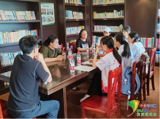 图为实践团成员与区委组织部人员李御章的交流。