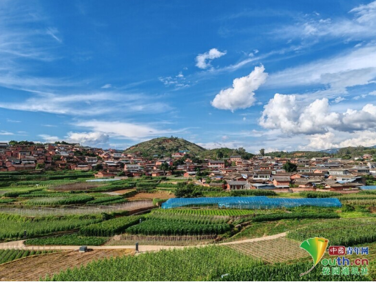 图为实践团成员在红椿树观景台拍摄的迤沙拉村全景。