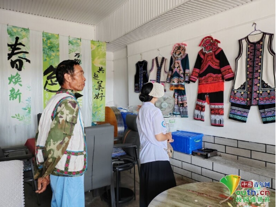 图为实践团成员在村民的家里,近距离观察彝绣服饰,感受彝族服饰文化的温度与力量。
