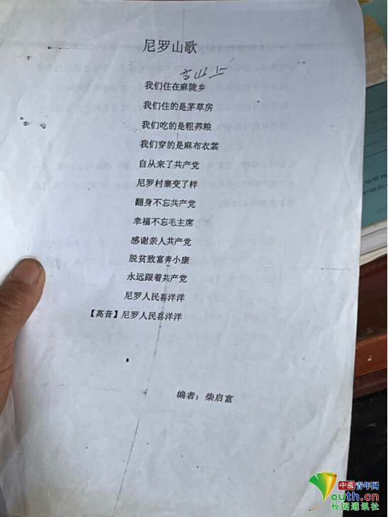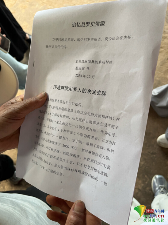 尼罗文字虽已失传,但尼罗话得以留存。柴启富身着尼罗服饰,用尼罗话演唱山歌,“尼罗村寨变了样脱贫致富奔小康”的歌词,生动描绘出尼罗人民的幸福生活。目前,他正致力于汉译尼罗话的编撰,希望以此传播尼罗文化。“整理尼罗话是我生前最后能为尼罗文化做的事,要把它留在麻陇,留给后人。”柴启富说。