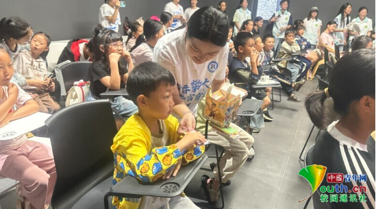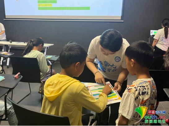 图为自主配音练习中,实践队队员深入其中为小朋友们讲解不会的字词和发音。