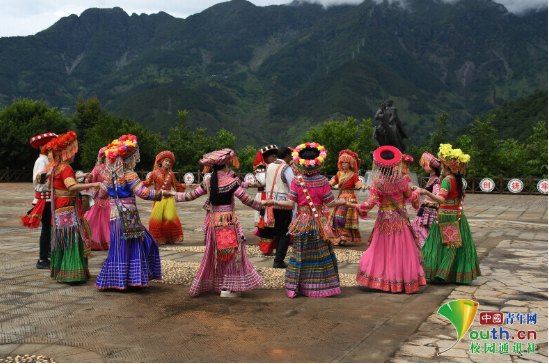 图为实践团成员与新山村表演队一同迎接北京—攀枝花首航游客。