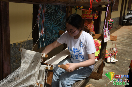 图为实践团成员体验新山村省级非遗项目——新山傈僳族织布技艺。