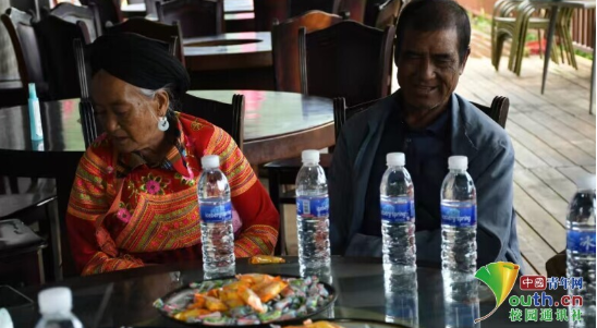 图为两位傈僳族老人对唱山歌迎接婚礼。