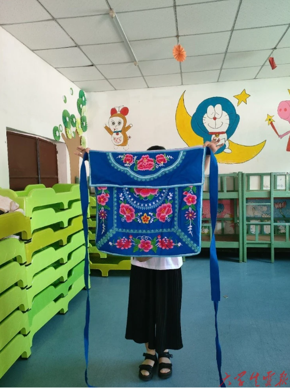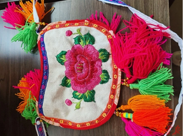 ▲图为迤沙拉村史馆展示的彝绣荷包(成品)