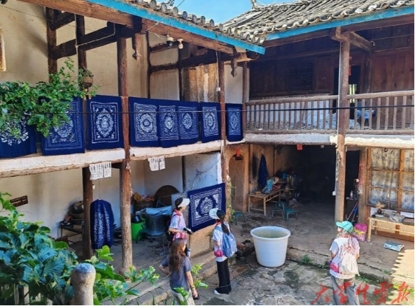 ▲图为迤沙拉百年老宅里晾晒的靛蓝绣布