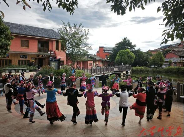 ▲图为迤沙拉村民身穿彝绣服饰在广场上打跳