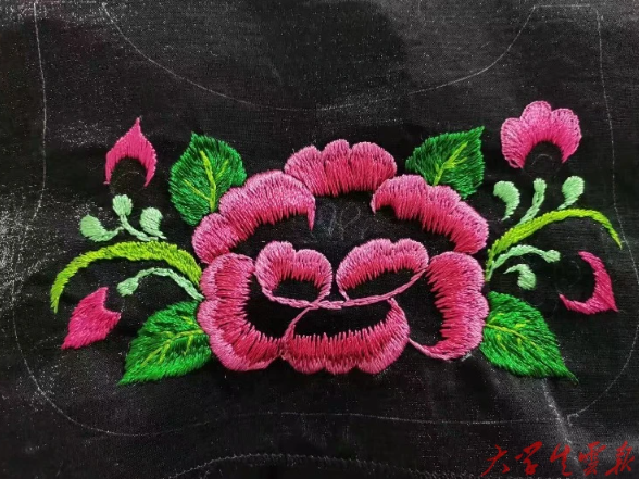 ▲图为迤沙拉彝绣非遗传承人纳永芳亲手所绣索玛花纹样