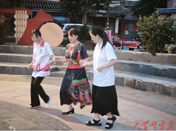 ▲图为迤沙拉村民吴玉琼教实践团成员彝族打跳
