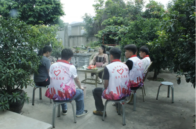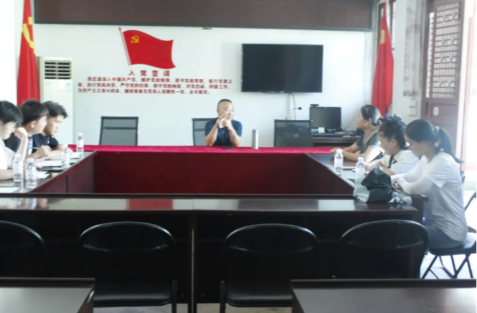 图为白马镇田坝村驻村第一书记与实践团详细介绍田坝村情况 张萌飞供图