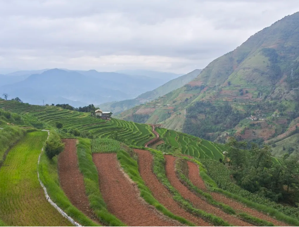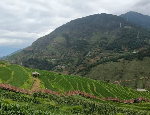 沿着梯田栈道前行,“稻香与咖啡”的别样景致映入眼帘,创意标牌与憨态可掬的稻草人,串联起传统农耕与文旅融合的新篇。漫步新山梯田间,嫩绿水稻禾苗与初长玉米植株相互映衬,细碎绿意铺满层层田垄,恰似一幅饱含希望的田园长卷。曾经,这片承载千年农耕文明的土地,因地理阻隔发展迟滞。而脱贫攻坚与乡村振兴战略的推进,不仅为新山村打通对外通道,更让傈僳族世代相传的农耕智慧重绽光芒,传统与现代在此交汇,绘就人与自然和谐共生的美好图景。