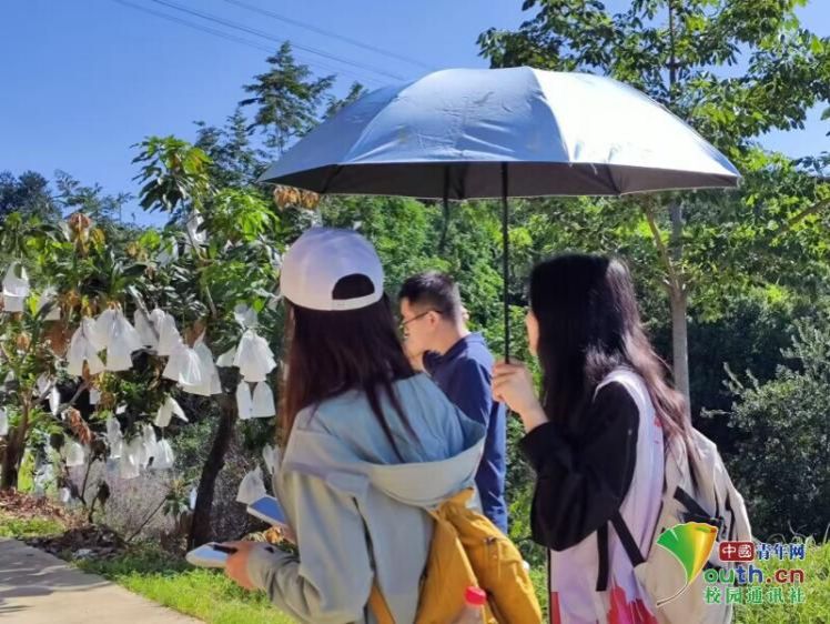 图为坚果基地负责人向实践团介绍坚果套种模式。刘玉梅 供图