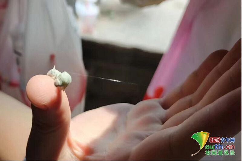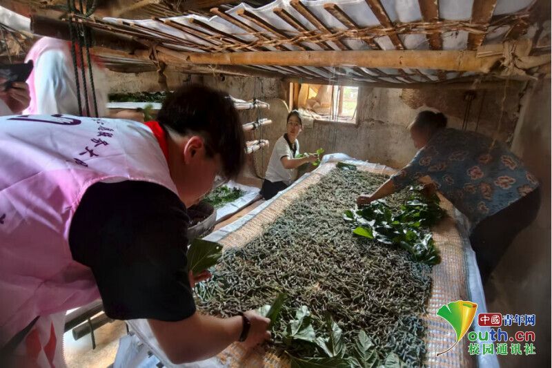 图为实践团成员体验喂蚕。张英琦 供图