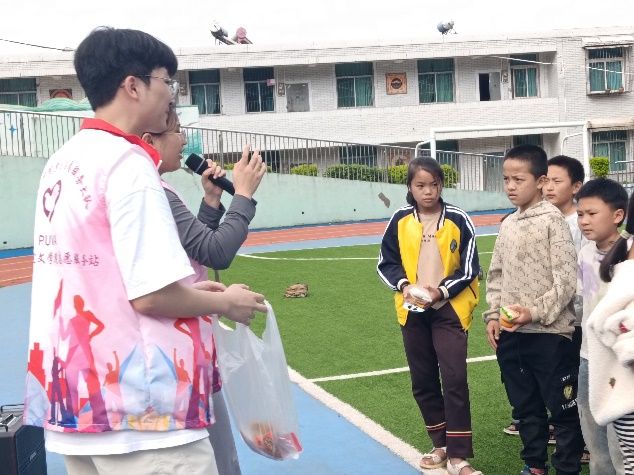 图为实践团队成员为参与活动的学生分发小礼品。胡莉 供图