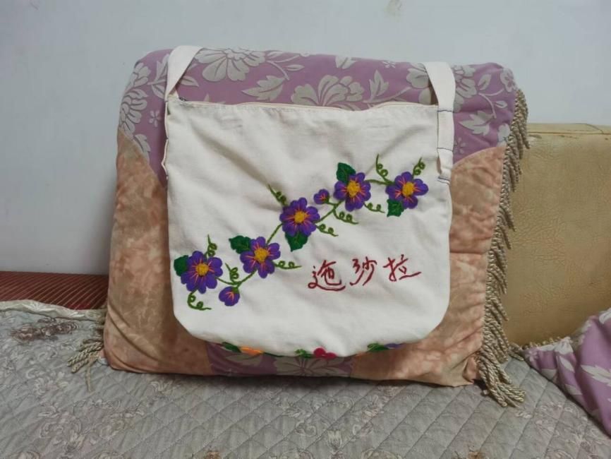 图为纳永芳在帆布包上绣的彝绣作品。纳永芳供图
