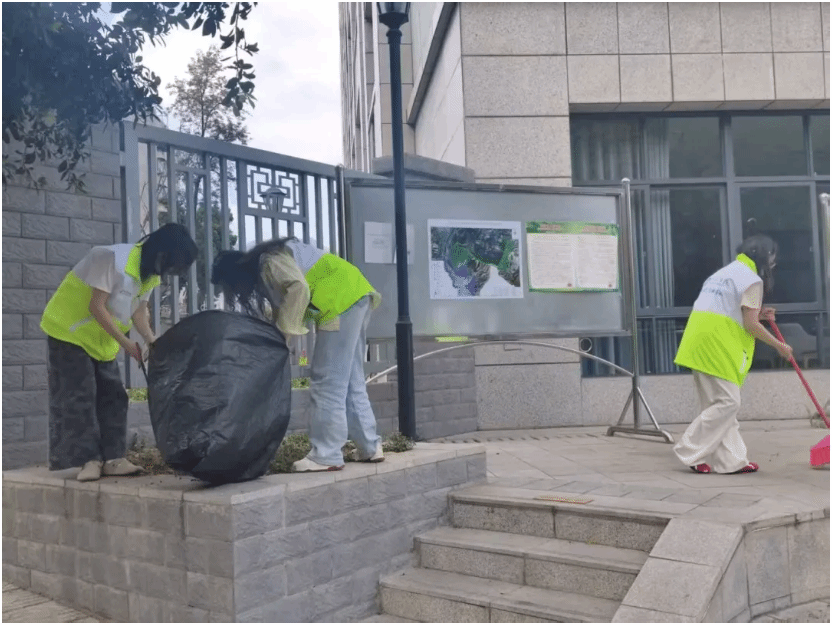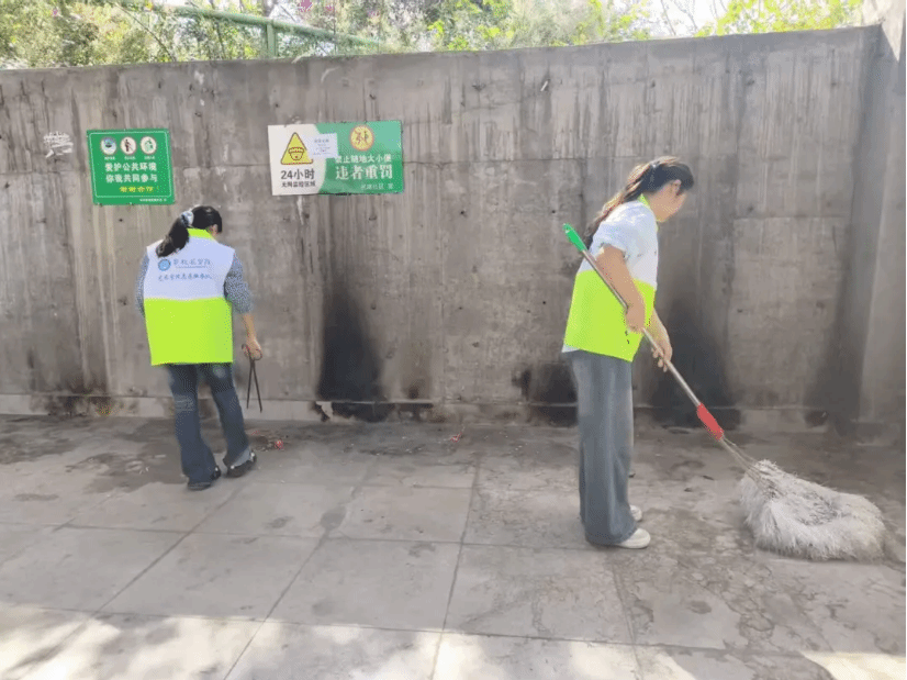 活动现场,志愿者们分工协作、各司其职,干劲十足、热情高涨。有的手持扫帚与簸箕,弯腰俯身认真清扫路面,细致清理落叶、纸屑等各类垃圾,不放过任何一处卫生死角;有的手持垃圾夹,小心翼翼深入绿化带,逐一捡拾烟头、塑料瓶等杂物,全力还原绿地整洁本色;还有的志愿者专注擦拭宣传栏、健身器材和公共座椅,耐心清理墙面小广告,让社区公共设施重新焕发光彩。大家不怕脏、不怕累,互帮互助、密切配合,用一双双巧手、一份份坚守,将奉献精神融入每一个细节,传递着青年学子的正能量。